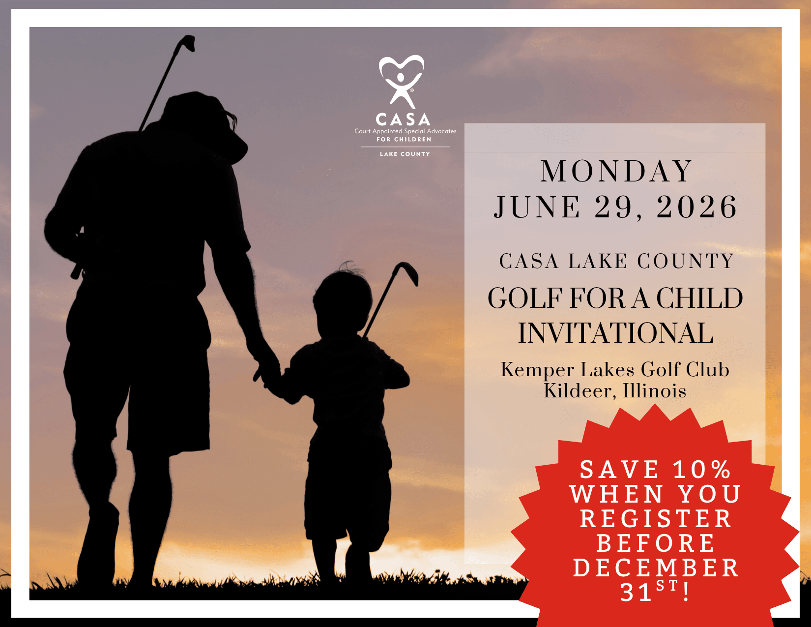 Join us on Monday, June 29, 2026 at Kemper Lakes Golf Club for CASA Lake County’s annual Golf for a Child Invitational! This signature event brings together community and corporate supporters for a memorable day on the course — all while helping give children who have experienced abuse or neglect the powerful voice of a CASA volunteer.